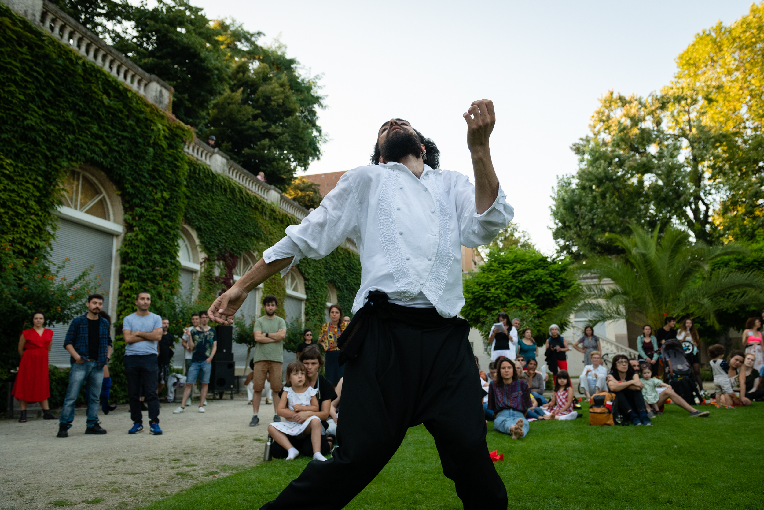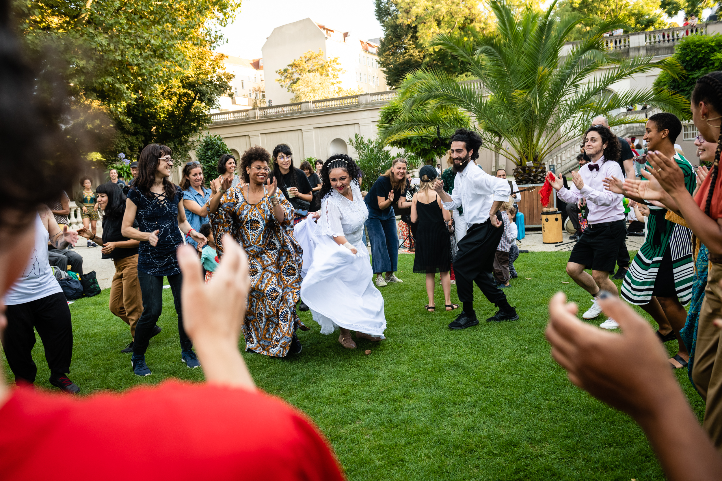 Im Garten vor der Galerie im Körnerpark sind die Gäste eingeladen, sich in die Hochzeitsgesellschaft zu mischen und Geschichten, Lieder, Essen, Musik, Traumata, Wünsche, Zweifel und Getränke zu teilen.